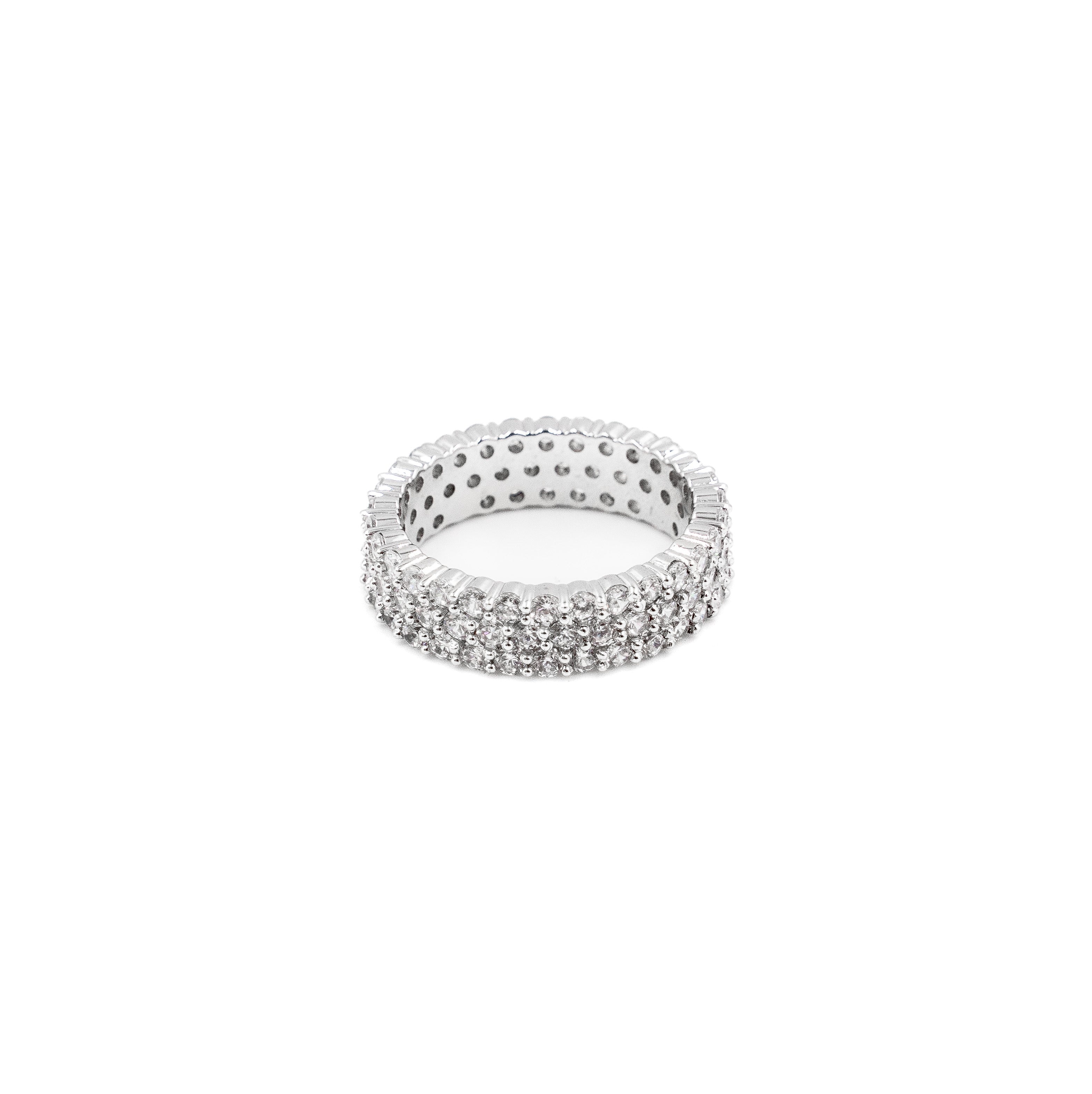| Three-row diamond band features three parallel rows of diamonds set into the band, creating a striking and elegant design. This style adds depth and brilliance to the ring, showcasing multiple layers of sparkling diamonds for a luxurious look. |