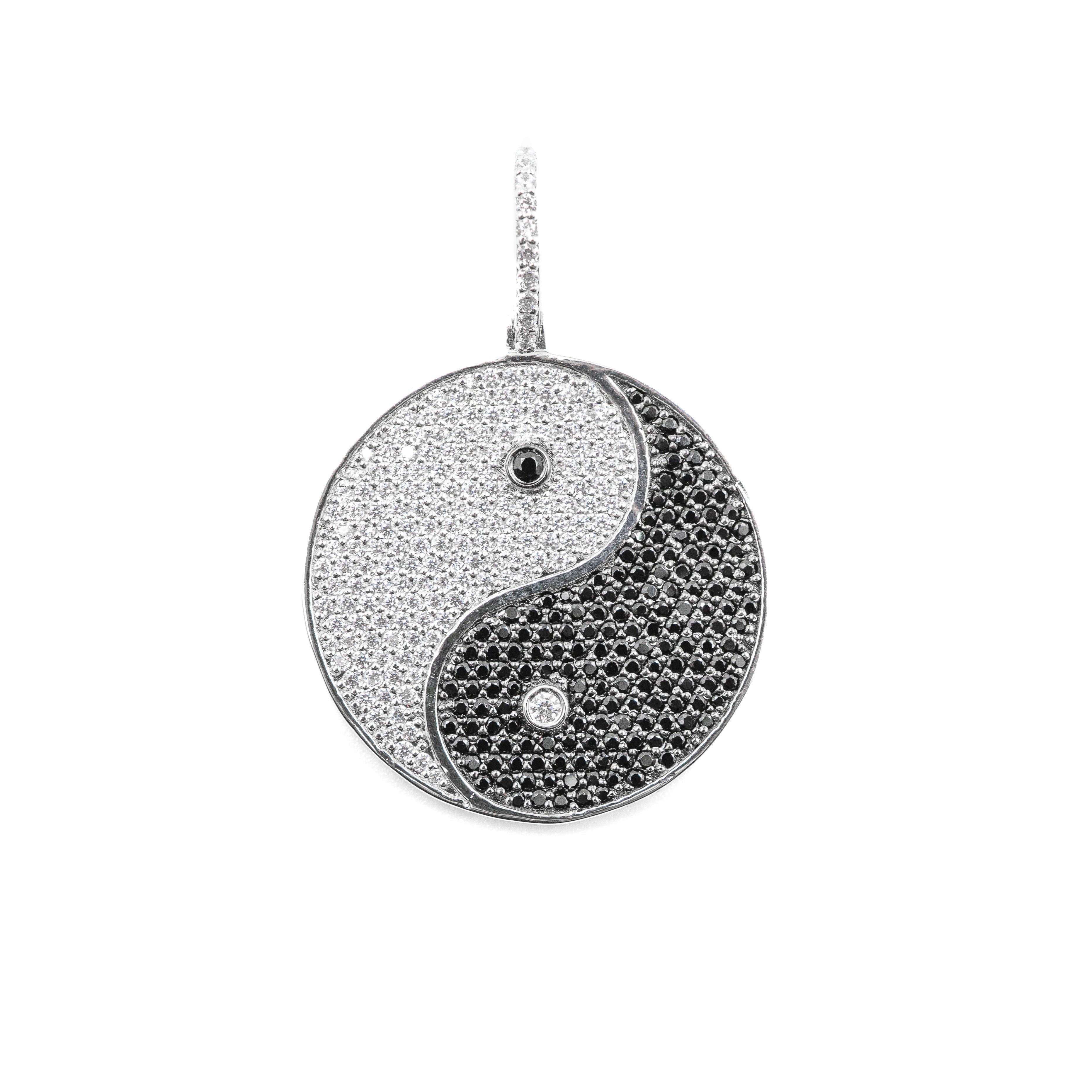 | Yin Yang diamond-studded pendant beautifully captures harmony and balance with a blend of white and black diamonds. Crafted in the iconic Yin Yang symbol, the pendant features meticulous arrangements of diamonds, symbolizing the interplay of opposites. The white diamonds elegantly complement the black ones, creating a stunning contrast that embodies the duality of life. |